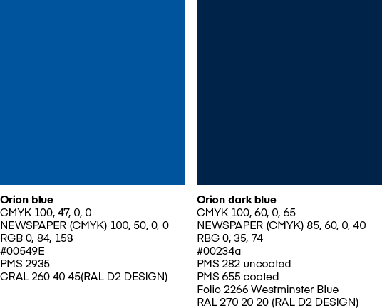 The primary colours used are Orion Pharma blue and Orion Pharma dark blue.